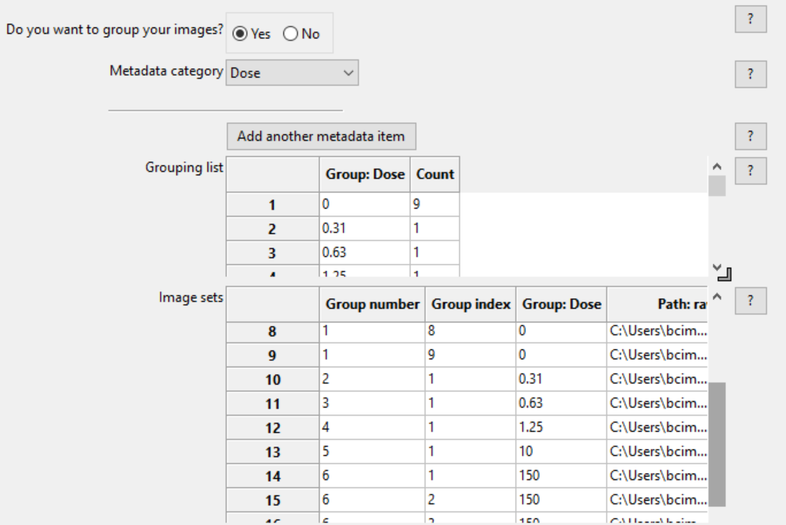 The grouping list (top table) shows the unique values of the selected metadata under the “Group” column; each of the unique values comprises a group. The “Count” column shows the number of image sets included in a given group; this is useful as a “sanity check” to make sure that the expected numbers of images are present.