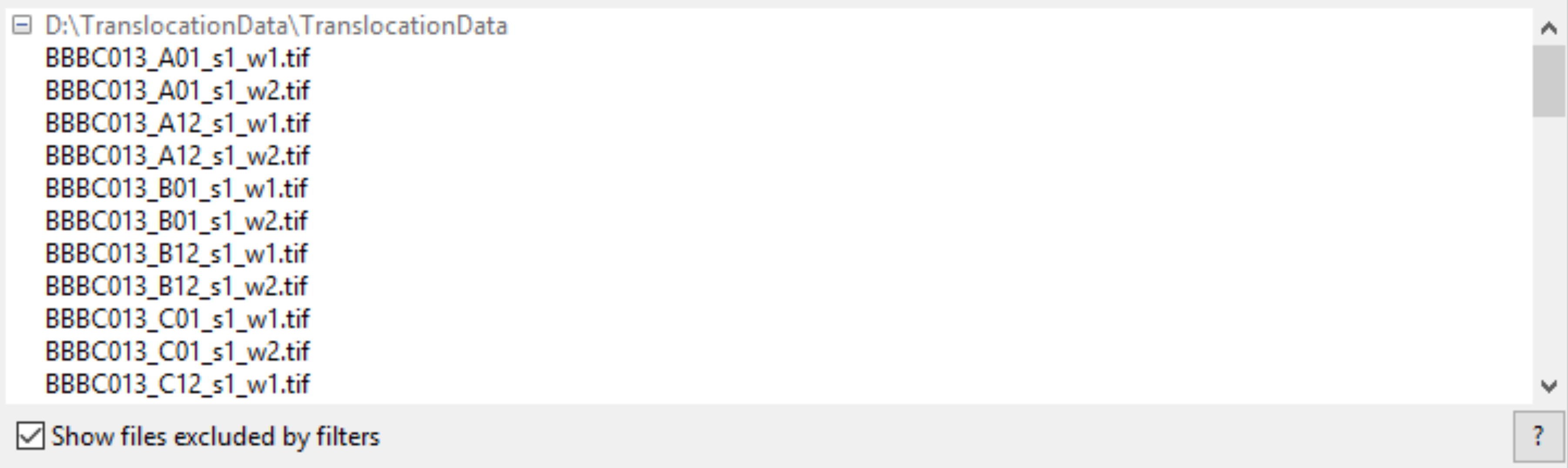 The final product of the Images module is a file list in which any files that are not intended for further processing have been removed, whether manually or using filtering. This list will be used when collecting metadata (if desired) and when assembling the image sets in NamesAndTypes. The list can be filtered further in NamesAndTypes to specify, for example, that a subset of these images represents a particular wavelength.