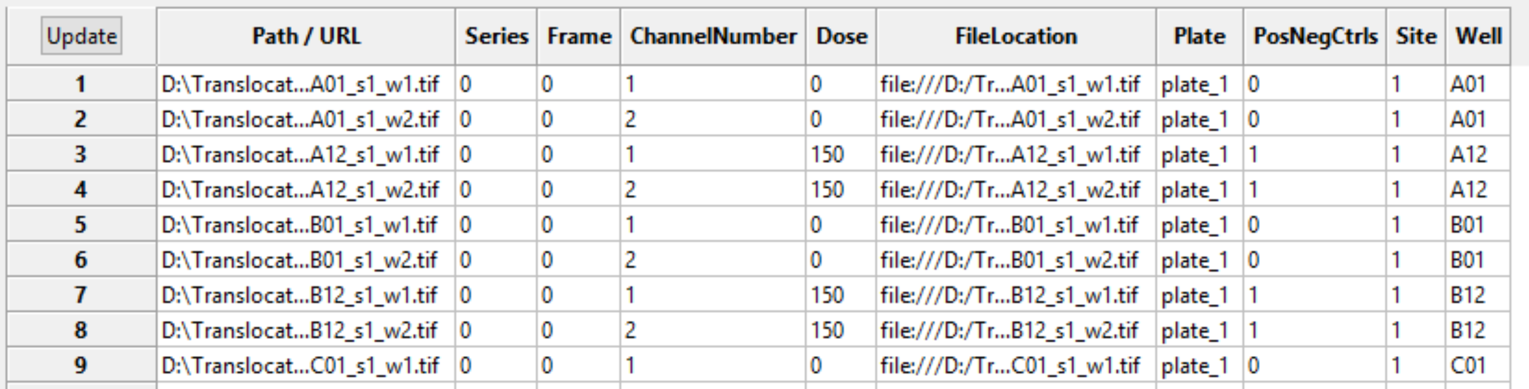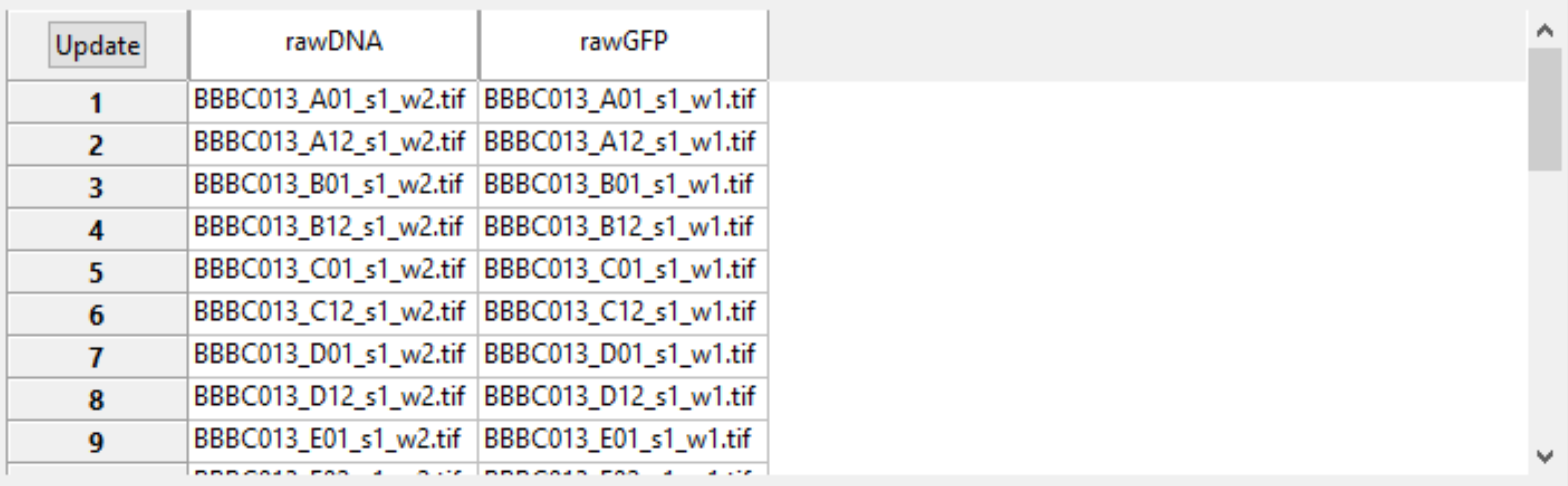 In order to see whether the images are matched up correctly to form the image sets you would expect, press the “Update” button below the divider to display a table of results using the current settings. Each row corresponds to a unique image set, and the columns correspond to the name you specified for CellProfiler to identify the channel. You can press this button as many times as needed to display the most current image sets obtained. When you complete your pipeline and perform an analysis run, CellProfiler will process the image sets in the order shown.